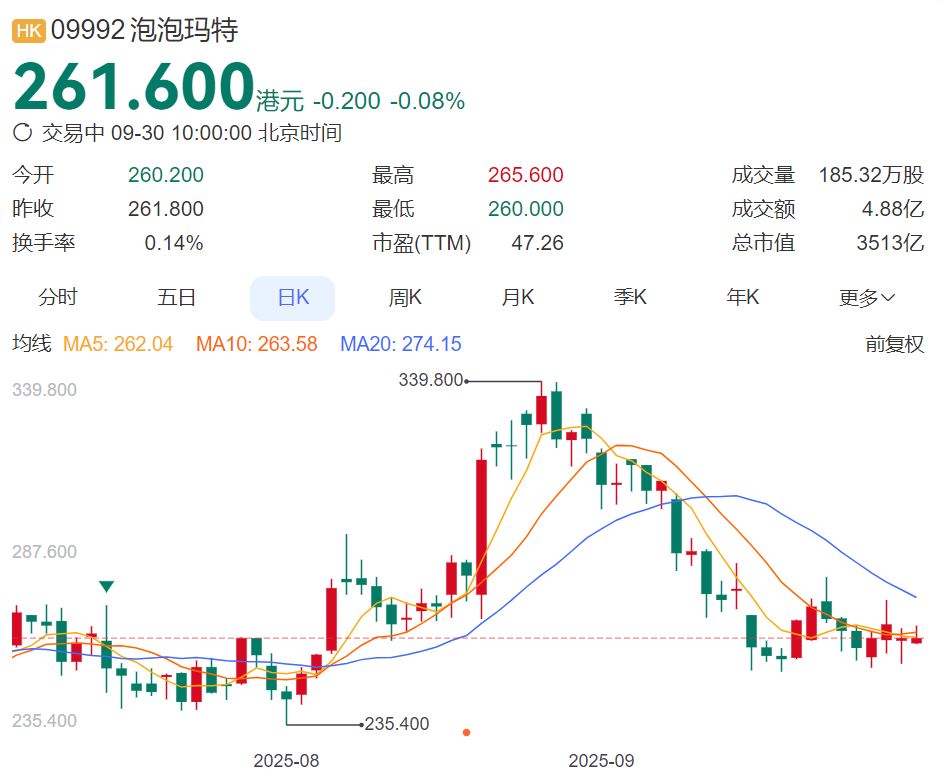 收尾9月30日发稿,泡泡玛特(09992.HK)报收261.6港元/股,总市值3513亿港元,近一个月内跌幅达19.3%。