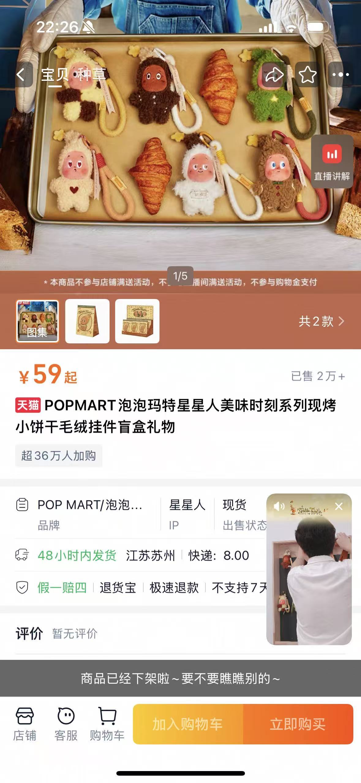 稳当开售后,两款星星东谈主系列居品均为秒空。开售格外钟后,天猫页面信息泄漏,小饼干毛绒挂件有超36万东谈主加购,但首批天猫官方旗舰店放货仅2万+件,手办盲盒玩物摆件泄漏已售3万+。