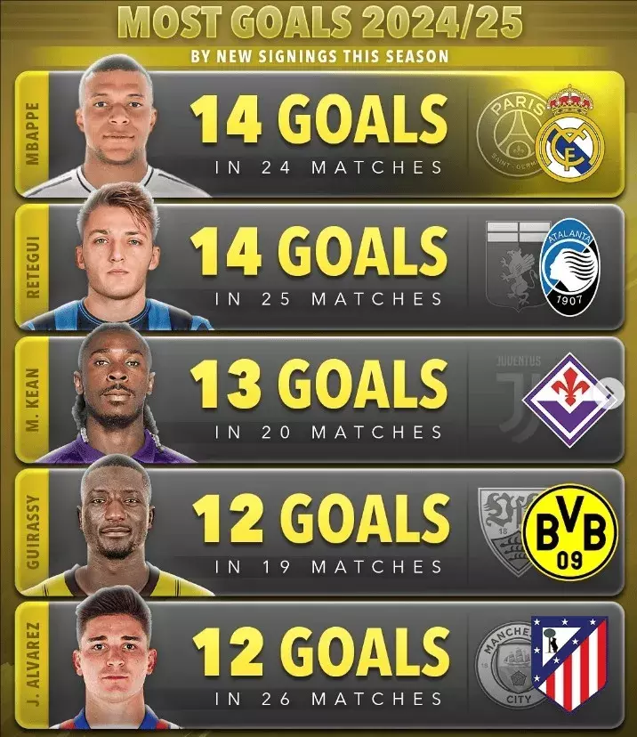 Score 90统计了本赛季五大联赛新援弓手榜,排行前五的球员笃定如下: