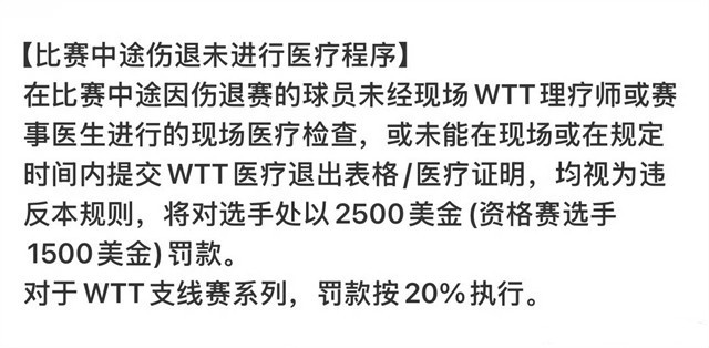 不外,也有不少东谈主缅念念,周启豪此次伤退也属于退赛,而按照WTT寰宇乒联的章程,退赛是需要罚金的,连樊振东、陈梦、马龙等顶尖球员齐不念念为此承受这么的管制,更别提口舌主力的周启豪了。有媒体东谈主对此证明现存国法进行了解读,“证明WTT新规,周启豪若是莫得接纳现场WTT 医疗师的查验、或指定医疗医师查验、或限定技艺提交关系历练文献,便可能遭到WTT最高可达2500好意思金(折合东谈主民币1.83万元)的罚金。”