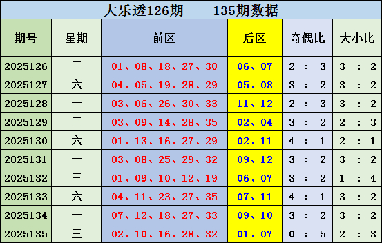 大乐透第2025135期开奖号码:前区02 10 16 28 32,后区01 07。前区奇偶比0:5,大小比2:3。